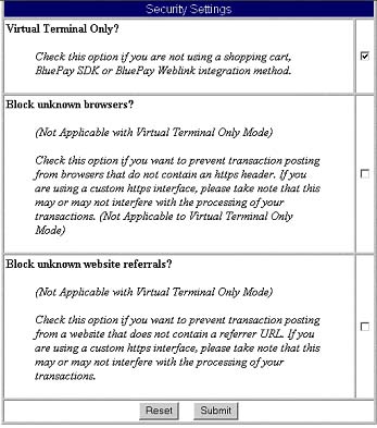 By default BluePay runs in "Virtual Terminal Only" mode. You will need to change this in the BluePay security settings shown below.